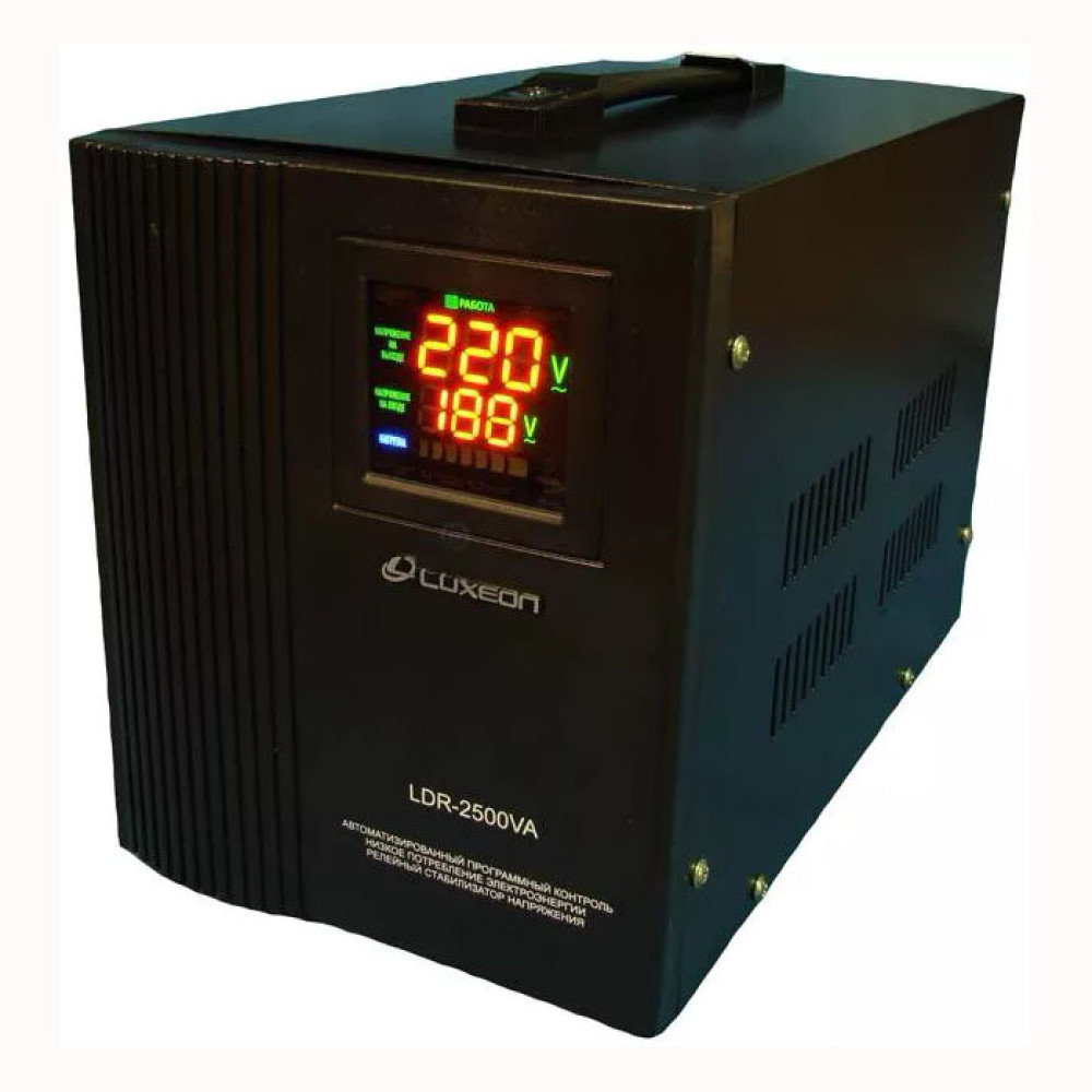 Luxeon LDR-2500 це добрий варіант стабілізатора напруга з релейним типом стабілізації. В основному призначений для вирішення стандартних питань із проблеми в електромережі. Особливість стабілізатора полягає в дозволеній кількості ступенів стабілізації тепер їх аж цілих 8, а робочий вхідний діапазон може змінюватися в межах від 105 до 270 В. Стабілізатор має багатофункціональний LED дисплей, який візуально відобразить режим роботи стабілізатора і напругу в мережі. У разі виникнення аномальної завищеної/заниженої напруги пристрій автоматично відключить підключені до нього прилади. Також Luxeon LDR-2500 захистить Вашу техніку від короткочасних високовольтних імпульсів, короткого замикання, підвищеної/заниженої напруги. Для зручності підключення техніки на задній панелі стабілізатора передбачено дві євро розетки.