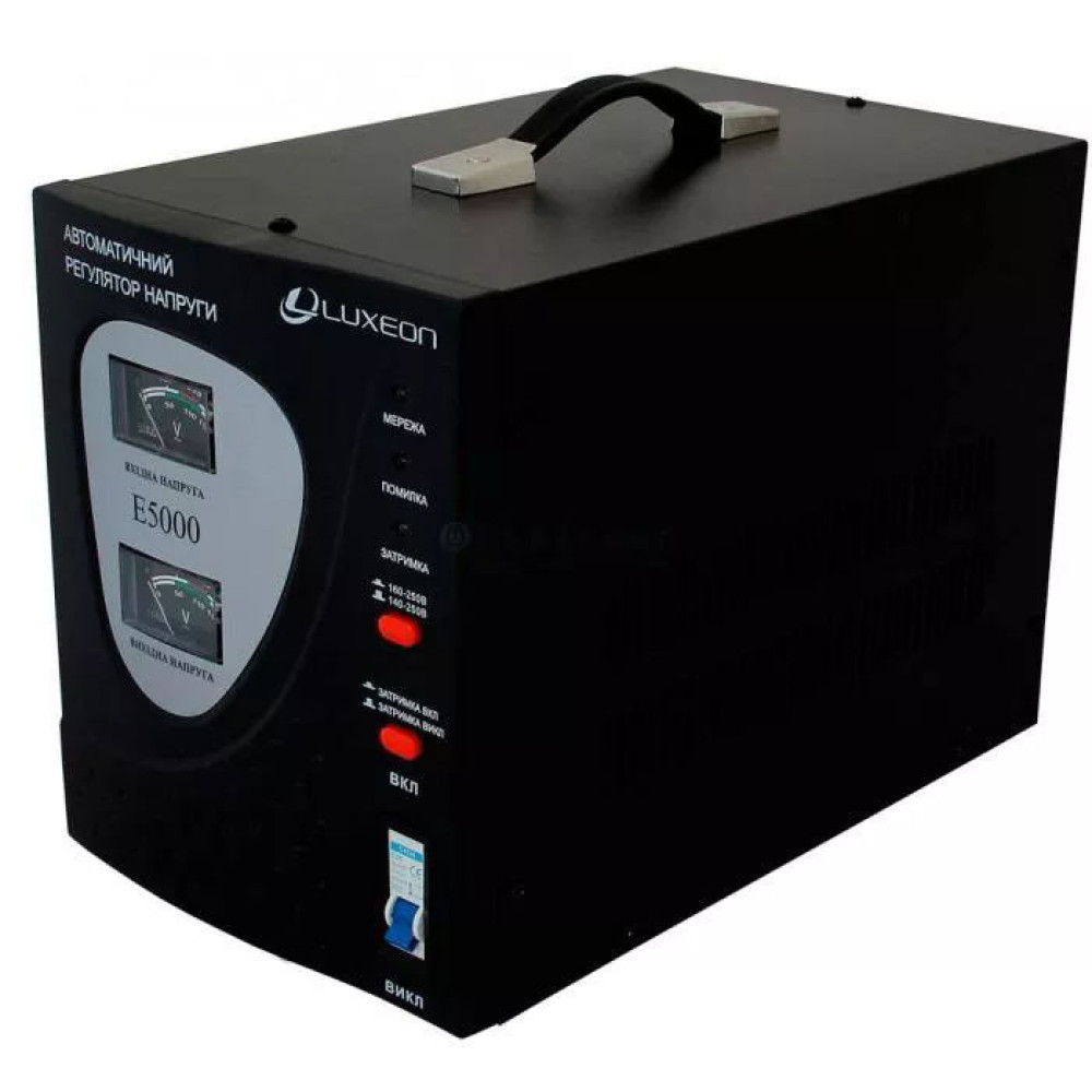 Luxeon E5000 – це надійний шестиступінчастий стабілізатор релейного типу, до якого можливе підключення різних однофазних споживачів. Завдяки наявності релейного механізму, пристрій моментально реагує на коливання напруги. Призначенням даного приладу є стабілізація напруги та забезпечення захисту електроприладів від різних неполадок, пов'язаних із неякісною електромережею. Передбачено наявність аналогового вольтметра, який вимірює напругу на виході та на вході. Дані про напругу відображаються на вбудованому рідкокристалічному дисплеї. Luxeon E5000 працює практично безшумно, що є важливим показником для забезпечення максимально комфортного середовища у процесі експлуатації приладу. Стабілізатор призначений для експлуатації у приміщенні. Luxeon E5000 розрахований для коректної роботи за досить широкого діапазону напруги.