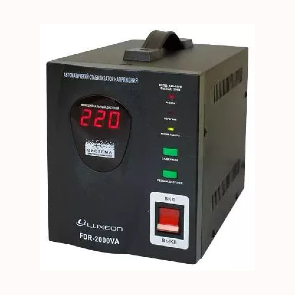FDR-2000 - это релейный стабилизатор мощностью 1400 Вт, пиковая пусковая мощность 2000 Вт позволяет использовать его для защиты холодильника, морозильной камеры, электроинструмента или нескольких приборов мощностью не более 1400 Вт.