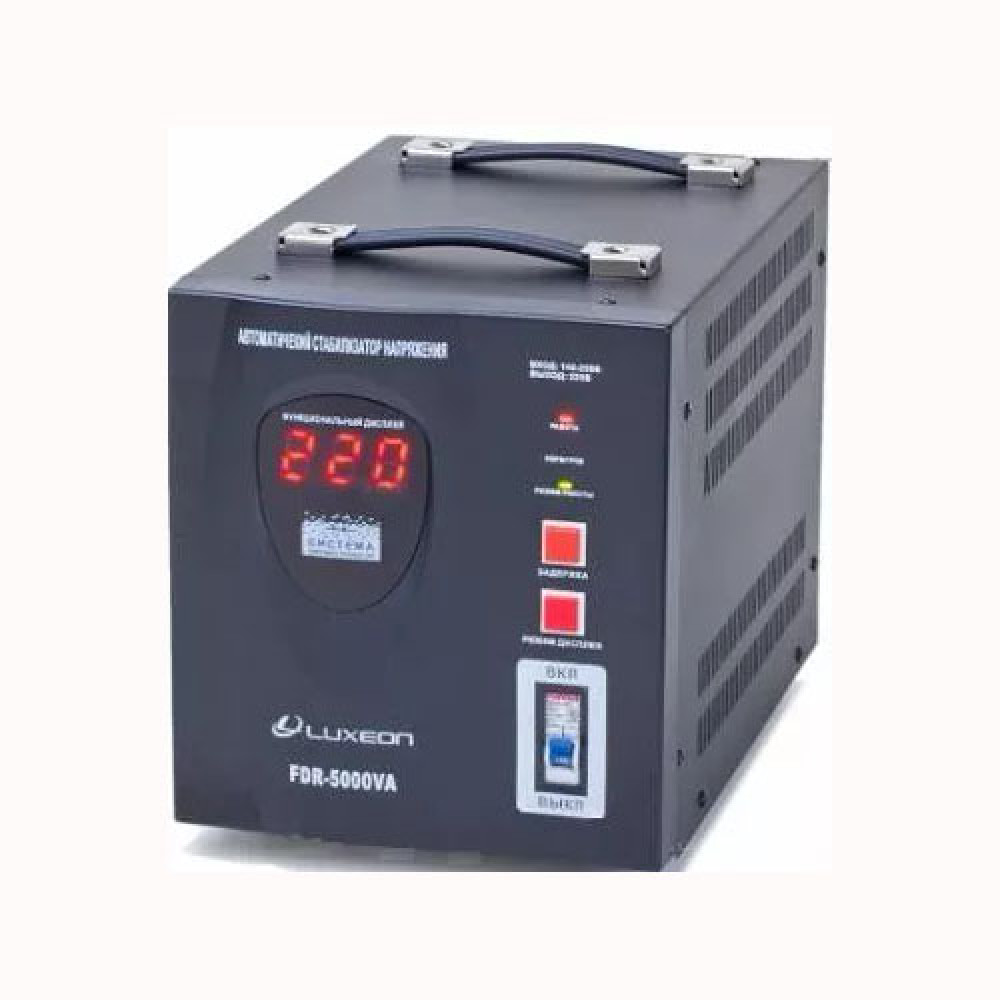 Стабилизатор LUXEON FDR-5000VA является качественным и надежным однофазным стабилизатором напряжения релейного типа с цифровым вольтметром входного и выходного напряжения. Имеет трансформатор средней мощности. Контроль входного напряжения осуществляется микропроцессором, благодаря чему стало возможное более точное и стабильное напряжения на выходе. Данный стабилизатор оснащен набором разного типу защит цель которых защитить вашу электросеть от скачков напряжения. При срабатывании одной из защит стабилизатор мгновенно и самостоятельно возобновит работу. Компактные размеры и небольшой вес позволяют устанавливать стабилизатор в любое удобное для вас место. Все силовые контакты сделаны из серебра, что предотвращает залипание контактов и увеличивает их срок службы. В данного стабилизатора установлена кнопка регулирующая время задержки перед включением 6 и 120 секунд. Нагрузка в данного стабилизатора подключается с помощью отводных клемм, а также установлена розетка для быстрого подключения различных приборов. В стабилизаторе находятся регулятор верхнего и нижнего указателя напряжения, при котором произойдет аварийное отключение стабилизатора. Данные регулятор поможет вам самостоятельно отрегулировать нужный вам порог чувствительности стабилизатора к низкому и высокому напряжению. У стабилизатора есть две удобные ручки для его переноски.