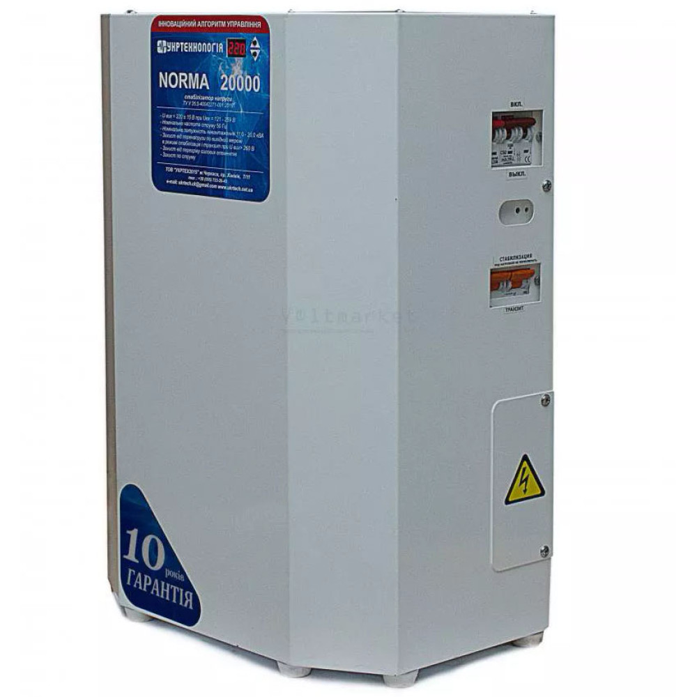 Снизив количество ступеней и, соответственно, тиристоров, производитель добился максимальной привлекательности данной модели. Количество ступеней определяет два основных параметра – точность и рабочий диапазон стабилизации. Производитель постарался добиться баланса при возможных ресурсах и обеспечил точность стабилизатора напряжения Укртехнология NORMA 20000 на уровне 7% (отклонения на выходе не будут превышать 15В), и рабочий диапазон в пределах 123-255В. Именно в рамках данного диапазона стабилизатор способен обеспечивать заявленную точность. Превышение диапазона приводит к уменьшению точности до 10% и, впоследствии, к незамедлительному отключению потребителей от сети, дабы уберечь их от недопустимого номинала напряжения.